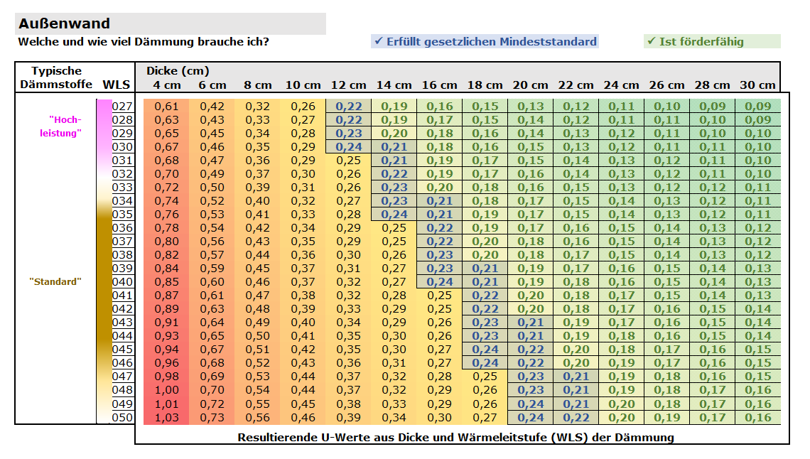 Der U-Wert ergibt sich aus der Dämmstoffdicke und dem verwendeten Material (z. B. Mineralwolle, Zellulose, Holzweichfaserplatten), denn nicht alle Materialien dämmen gleich gut. Nutzt man ein Material, das nur wenig Wärme nach außen leitet, also gut dämmt, braucht man natürlich weniger davon. Damit man die verschiedenen Produkte am Markt vergleichen kann, geben Hersteller die „Wärmeleitfähigkeitsstufe“ an, abgekürzt: WLS.Anhand von Tabellen kann man vereinfacht ablesen, bei welcher Wärmeleitfähigkeitsstufe (links) und welcher Dämmdicke in cm (oben) man welchen U-Wert erreicht. Blau gefärbte U-Werte sind solche, die den gesetzlichen Mindeststandard einhalten, grün gefärbte U-Werte sind solche, für die man Fördergeld bekommt: